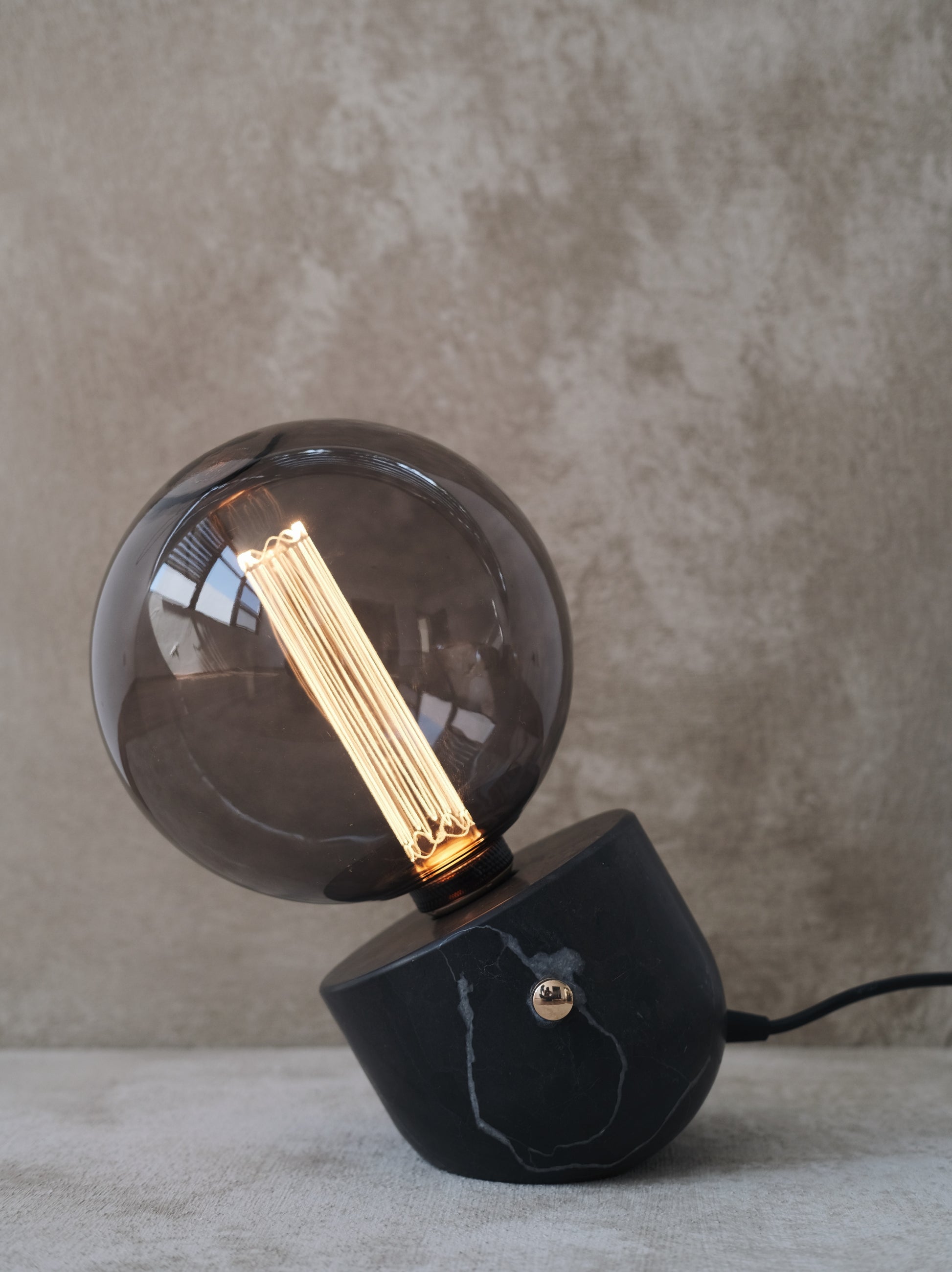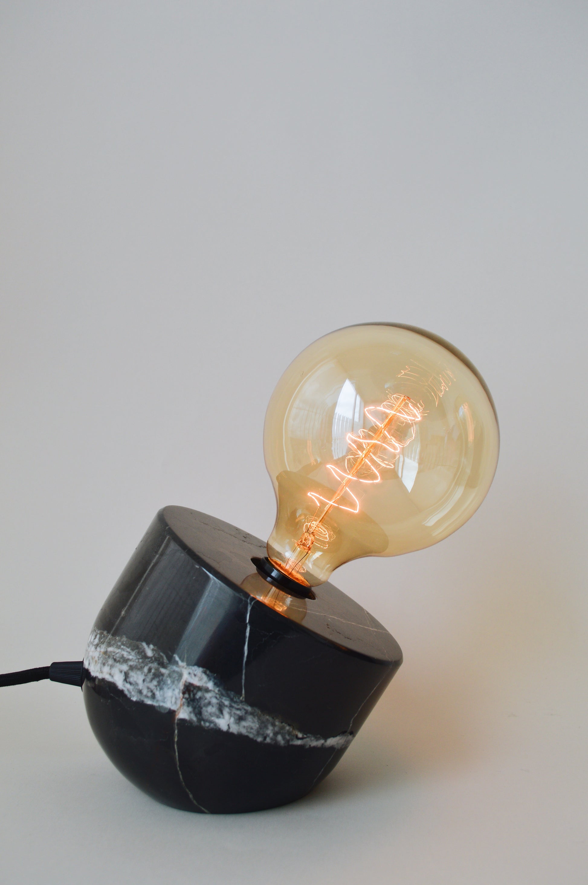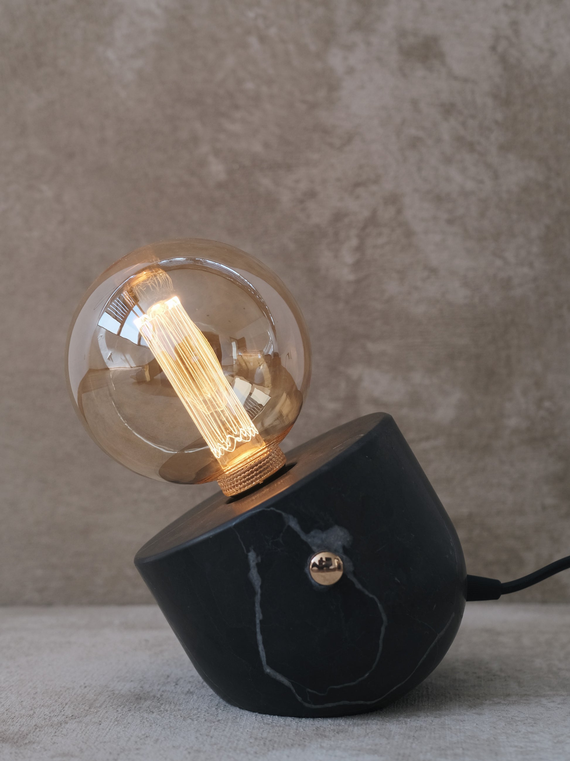 Lámpara de mesa elaborada en mármol negro natural con vetas que convierten cada pieza en un objeto único. Una pieza decorativa y a la vez funcional, ideal para colocar en burós, escritorios o mesas auxiliares.