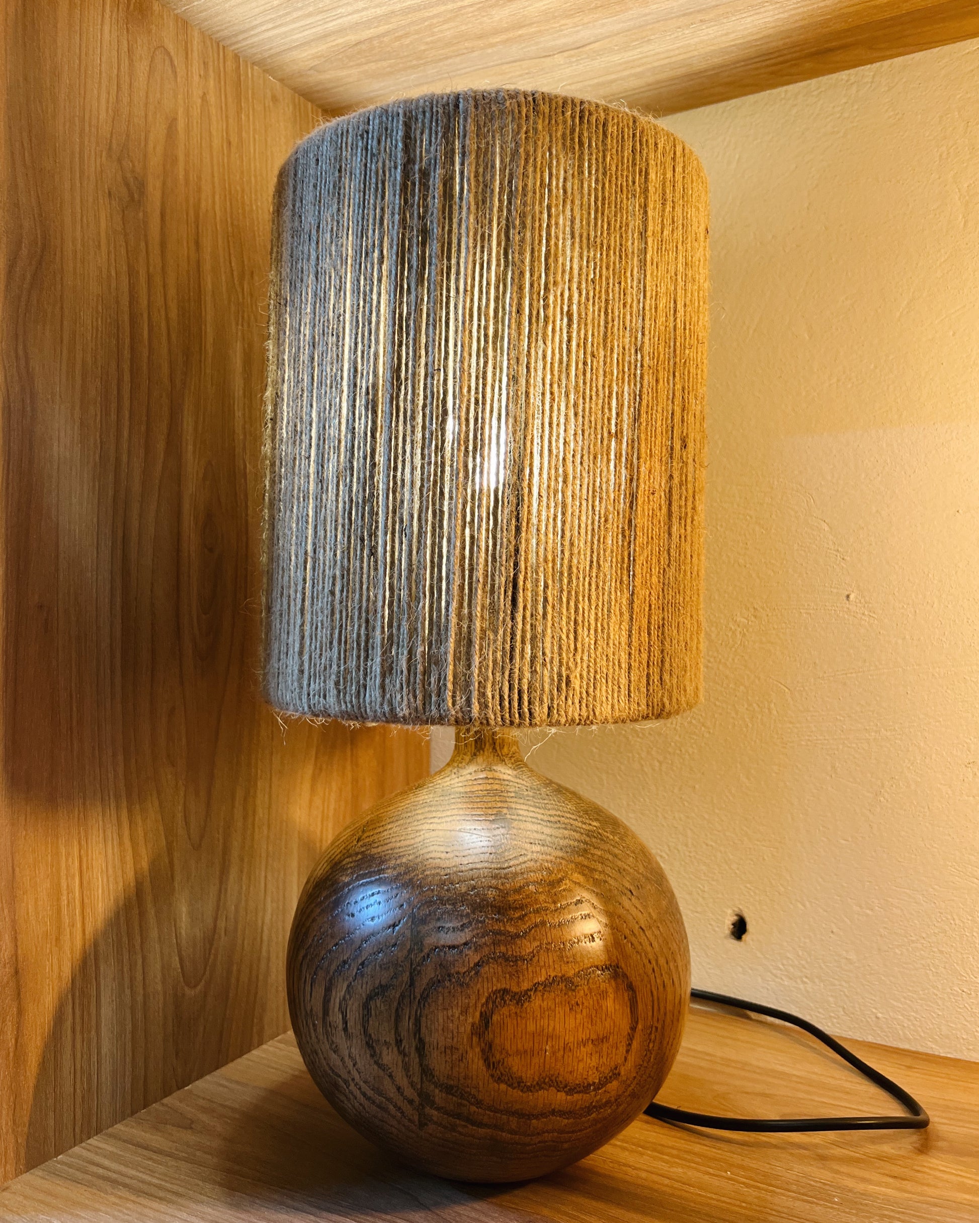 Lámpara hecha a mano, torneada y tejida por nuestros artesanos. Hecha a base de madera maciza de encino torneada, entintada y barnizada con acabado de poliuretano acabado semi mate. Pantalla de yute.