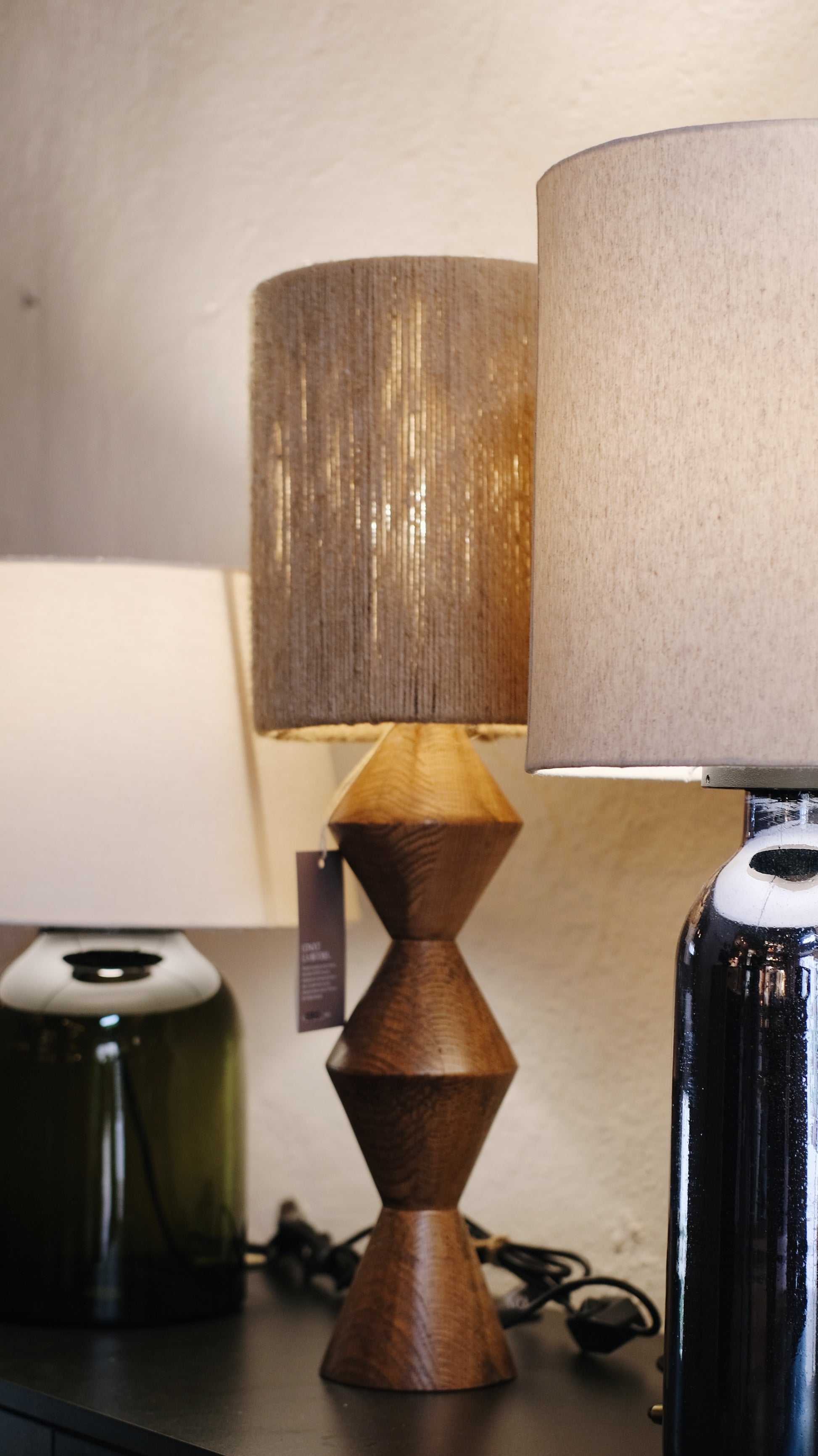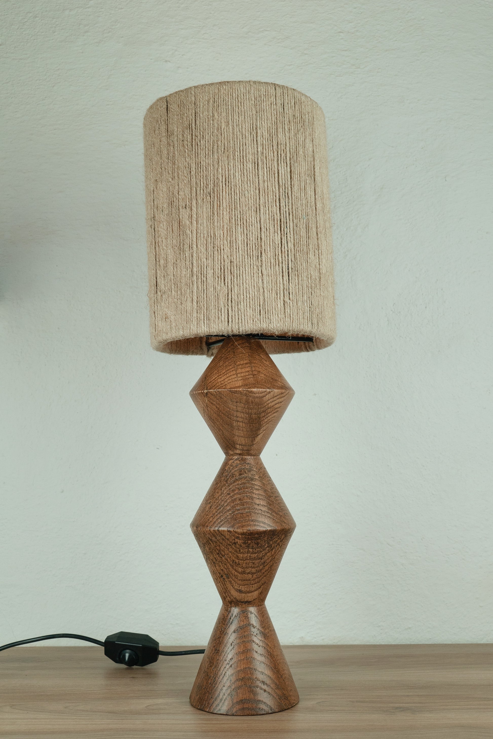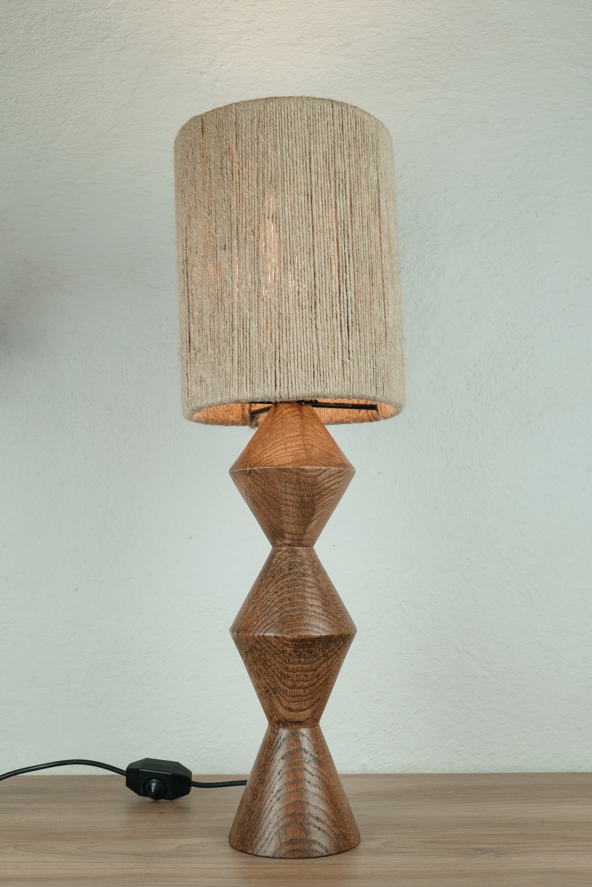 Caracterizada por darle un ambiente cálido y original a tus espacios. Lámpara de mesa hecha a base de madera maciza de encino torneada, entintada y barnizada con acabado de poliuretano acabado semi mate. Pantalla de yute.