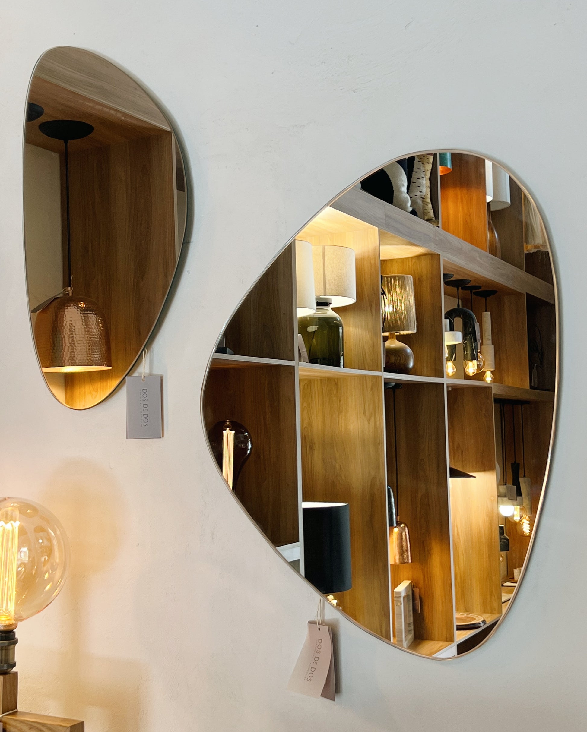 Set de dos espejos con de forma irregular con canto pulido y bastidor de aluminio para su fácil instalación.